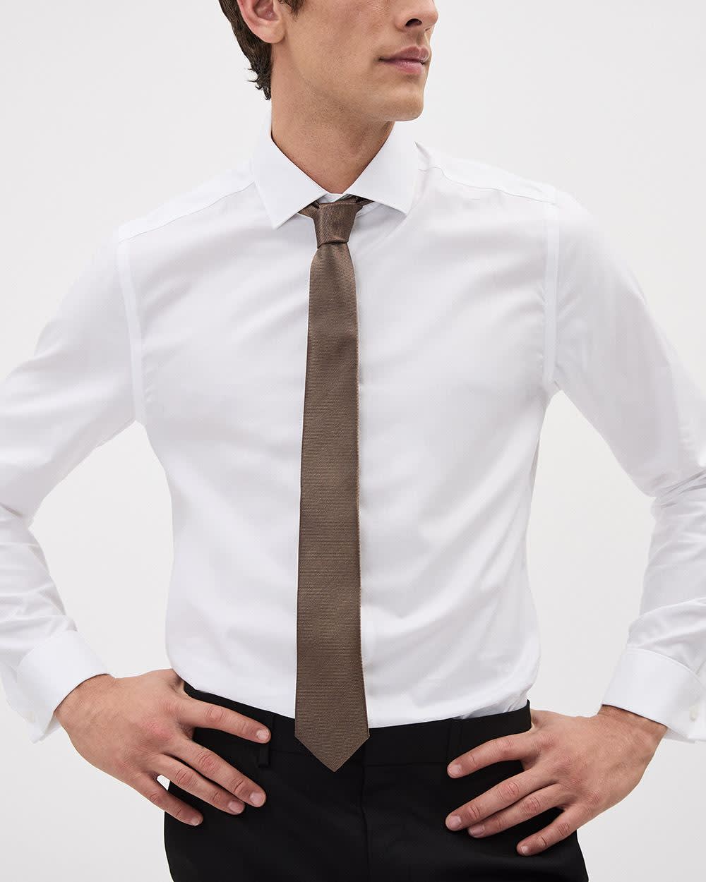 Rehaussez votre look avec cette cravate étroite unie entièrement conçue en soie brune.