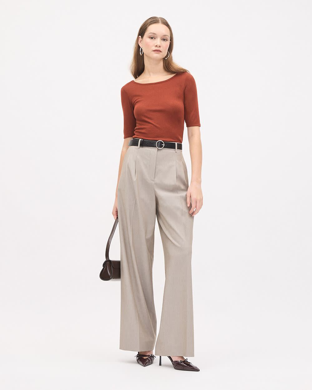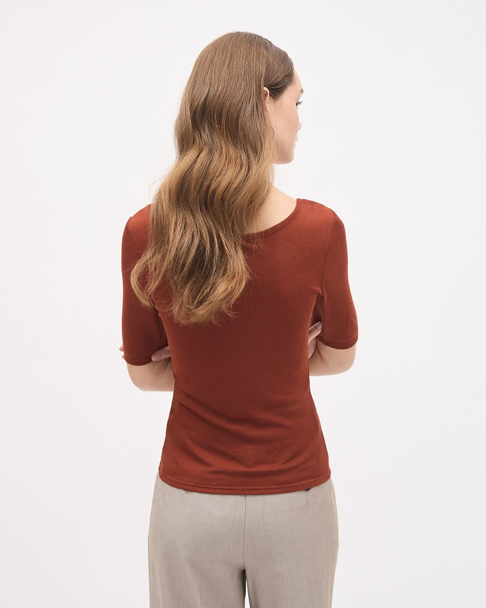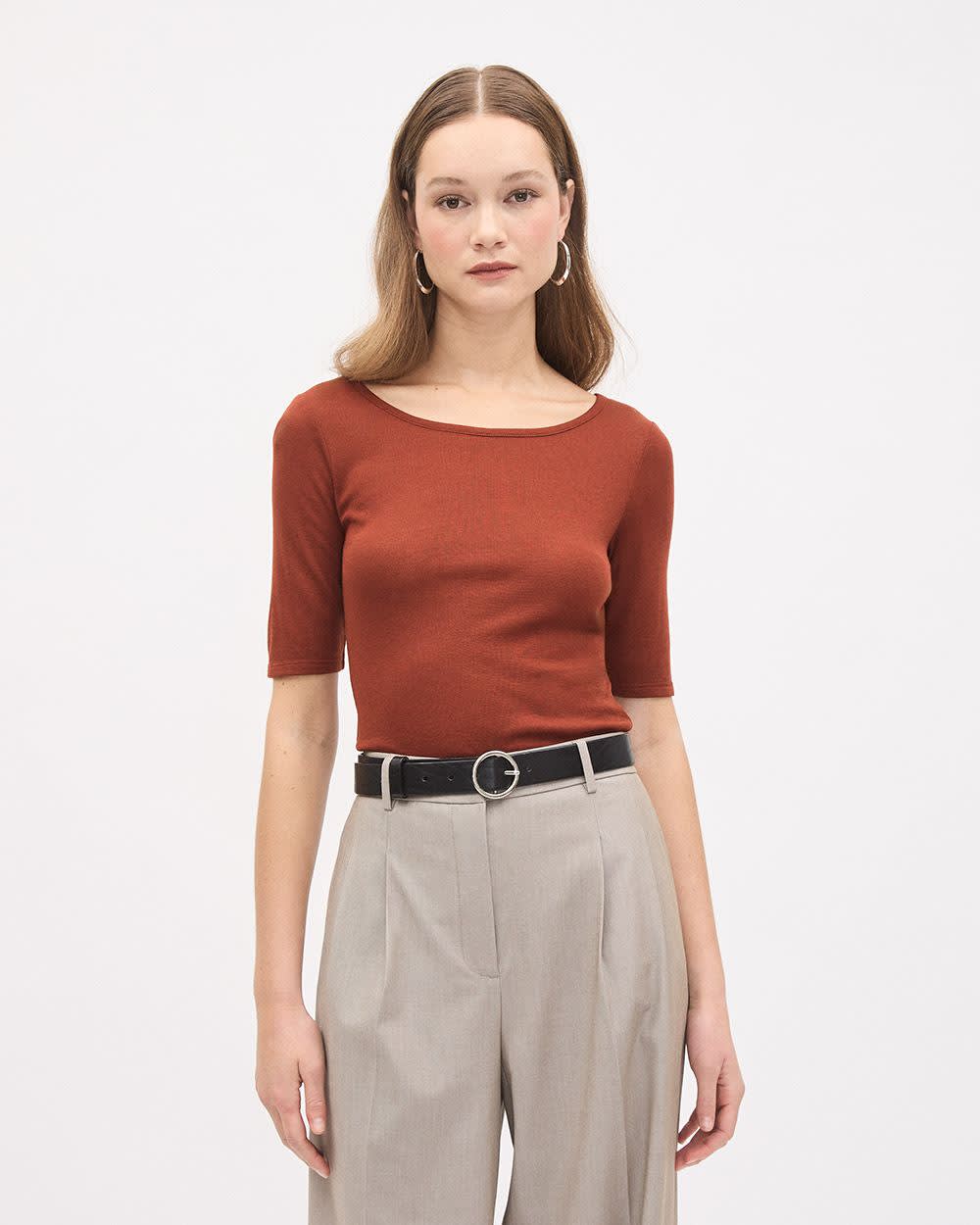 Conçu dans un tricot doux, ce t-shirt à coupe classique doté de manches aux coudes et d'un col dégagé est un haut idéal pour le quotidien. Agencez-le avec votre bas favori pour un look décontracté qui saura se démarquer.