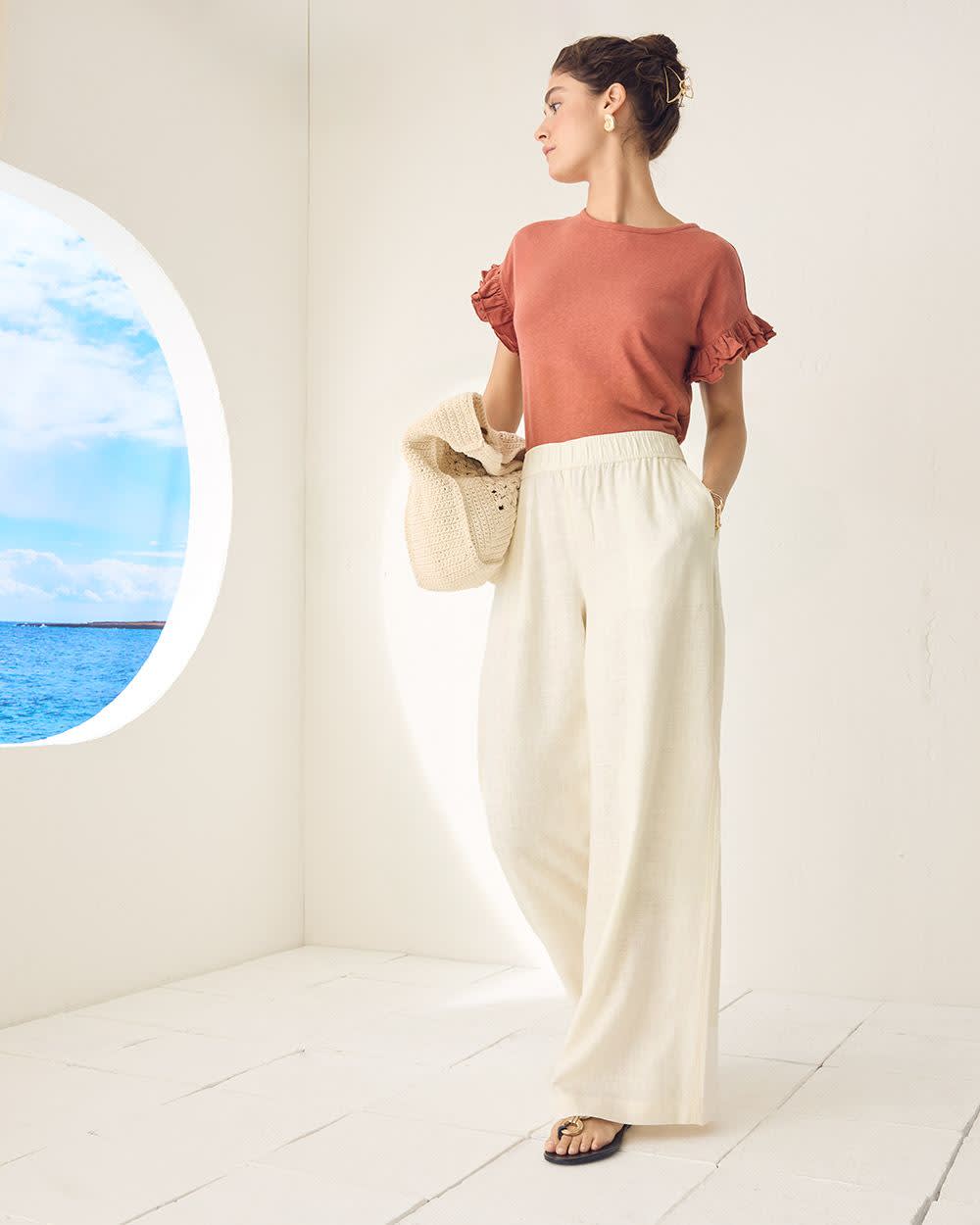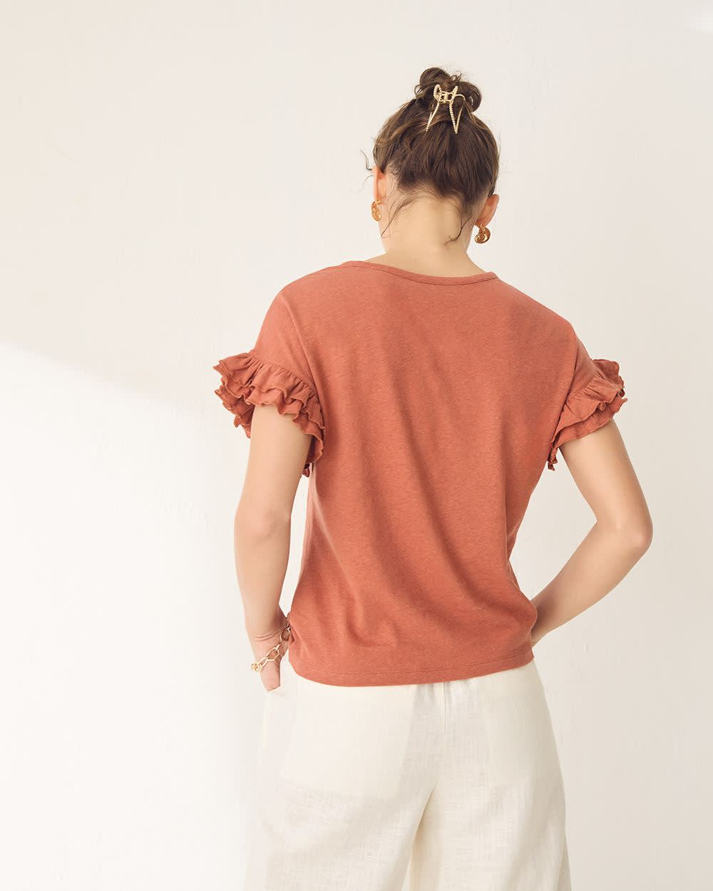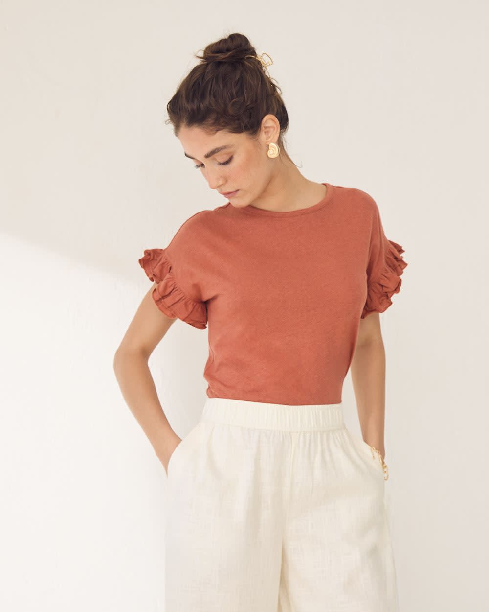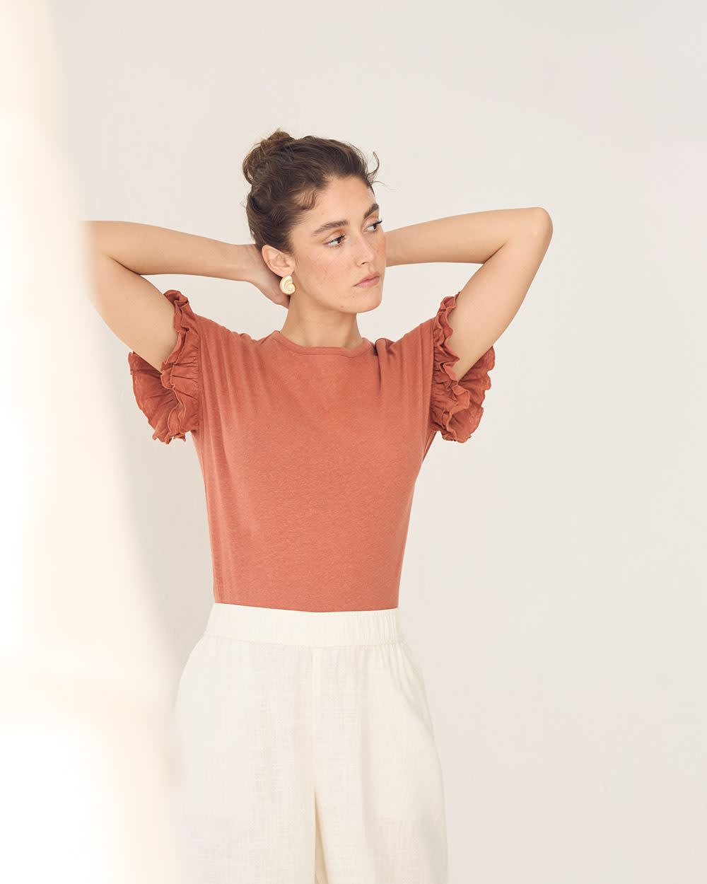 On adore les détails à volants de ce simple haut à col rond. Conçu dans un doux mélange de lin et de coton, ce haut est parfait lorsque vous désirez ajouter une touche jazzy à votre style.