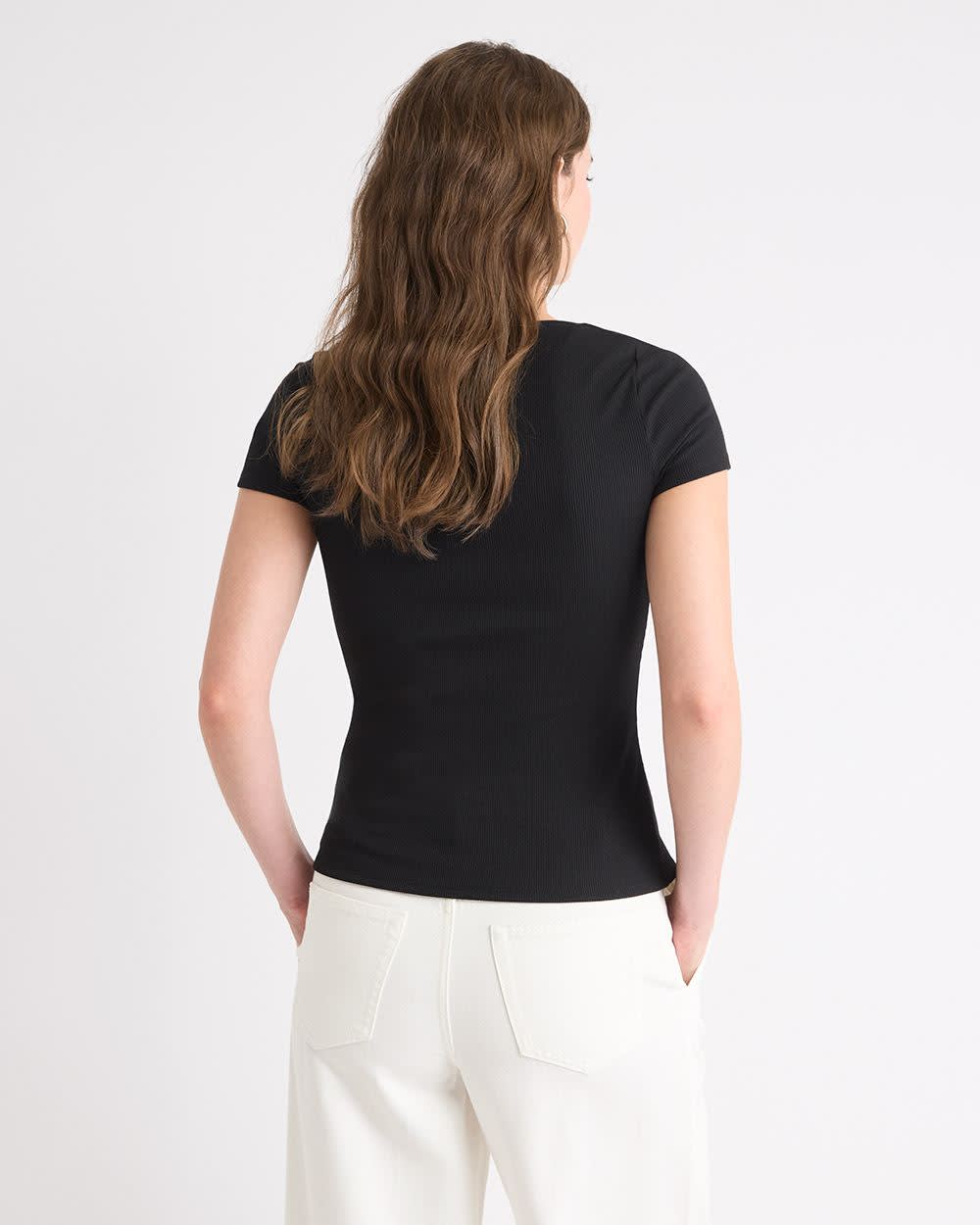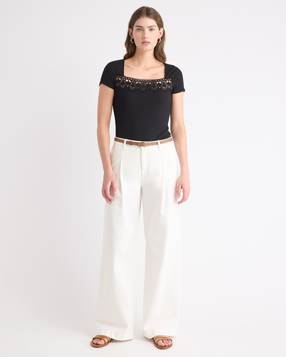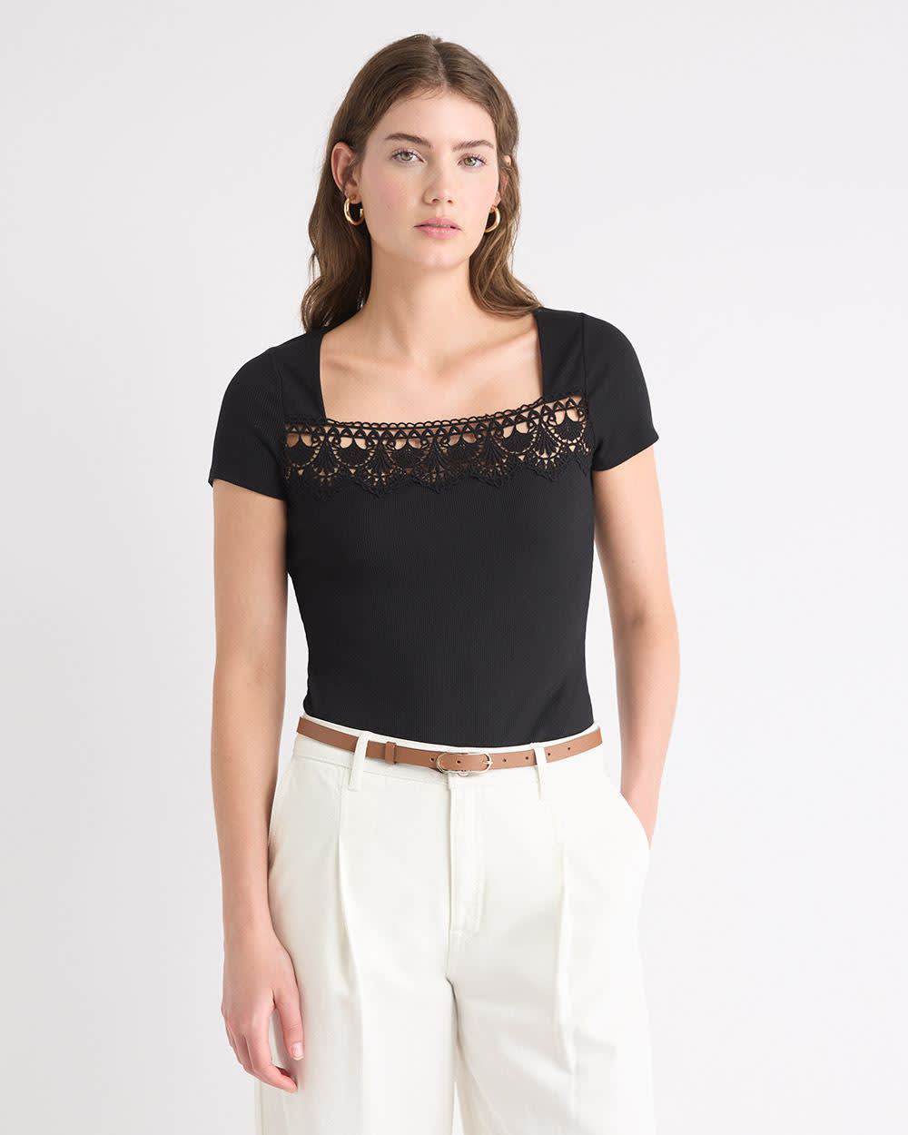 Conçu en tricot côtelé extensible qui épouse la silhouette, ce haut ajusté à manches courtes doté d'un col carré décoré de féminins détails crochetés, transformera votre tenue décontractée de tous les jours en une tenue sophistiquée, tout en conservant un confort optimal.