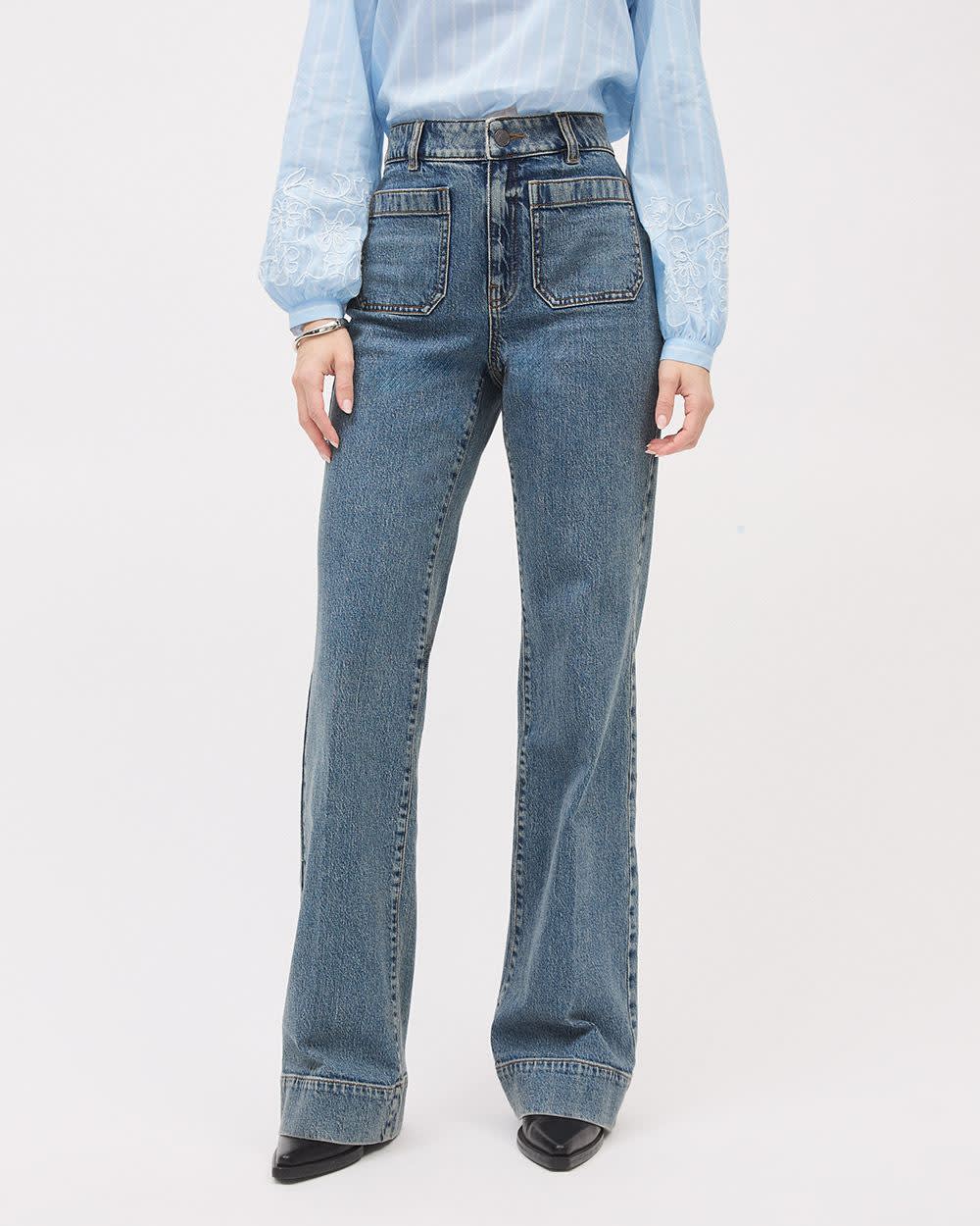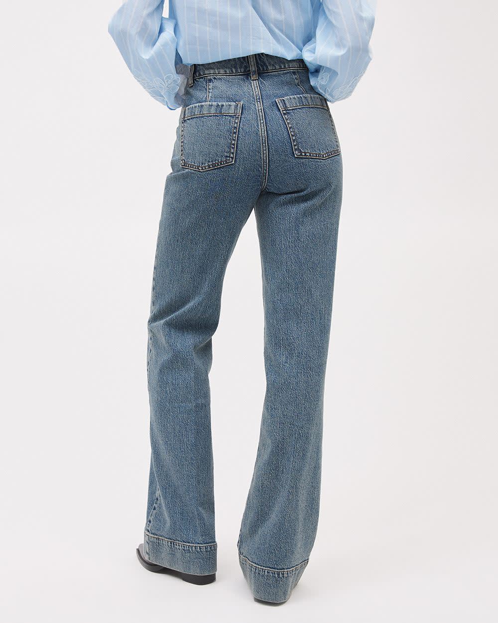 Tout le monde a besoin d'un jean à délavé moyen dans sa vie. Conçu avec une confortable taille haute, une jambe large, et doté de tendances poches appliquées qui sauront se démarquer, ce jean est définitivement un essentiel à ajouter à votre garde-robe.