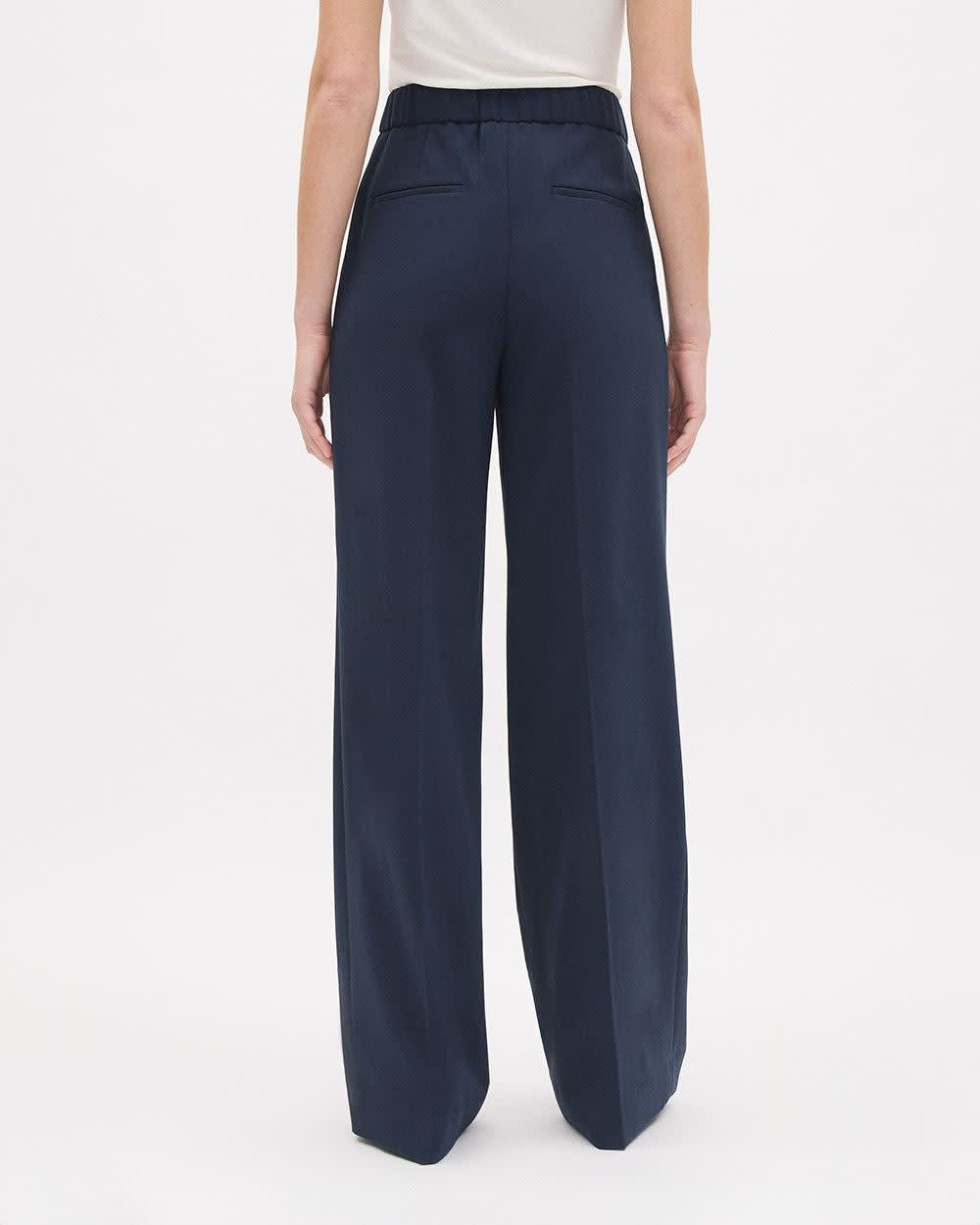 Ce pantalon à taille haute doté d'une jambe large pleine longueur et d'une bande de taille élastique au dos vous assure élégance et style. Conçu en crêpe noir satiné, ce pantalon est une pièce essentielle à ajouter à votre garde-robe professionnelle.