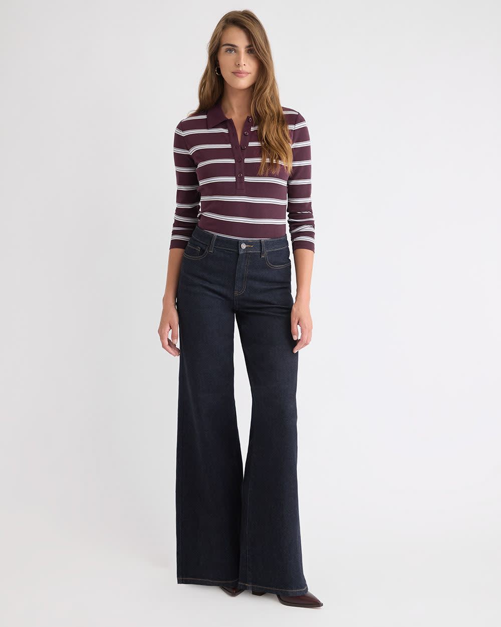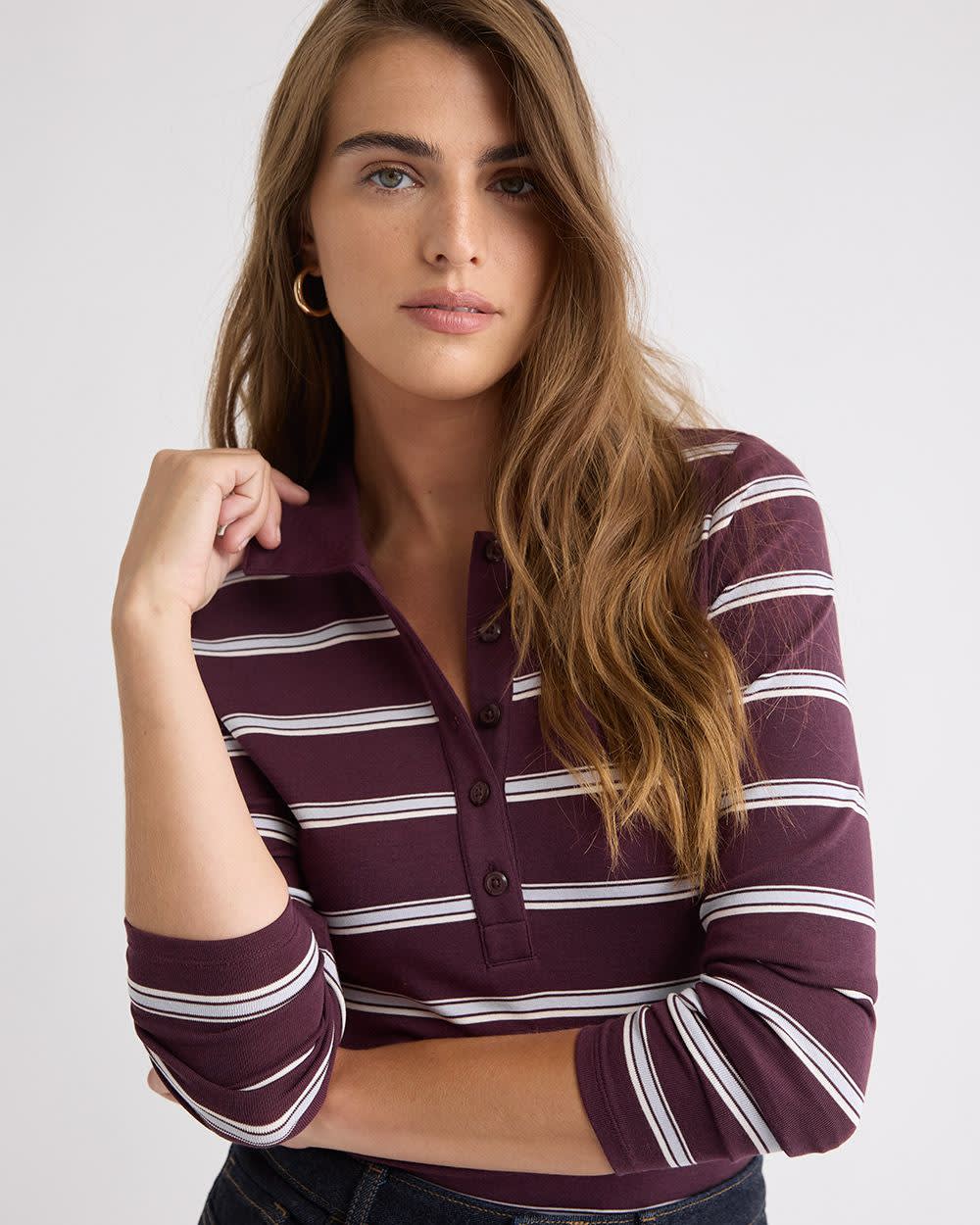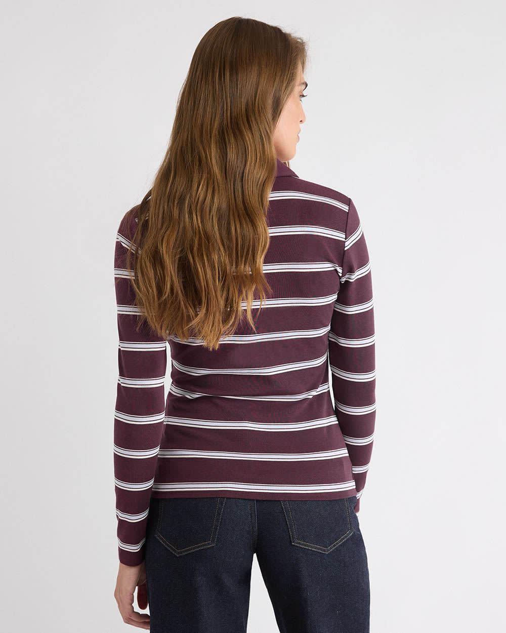 On adore la longue patte boutonnée de ce simple polo rayé. Conçu dans un tricot côtelé doux et confortable, ce haut vous procurera un style de tous les jours des plus tendance.