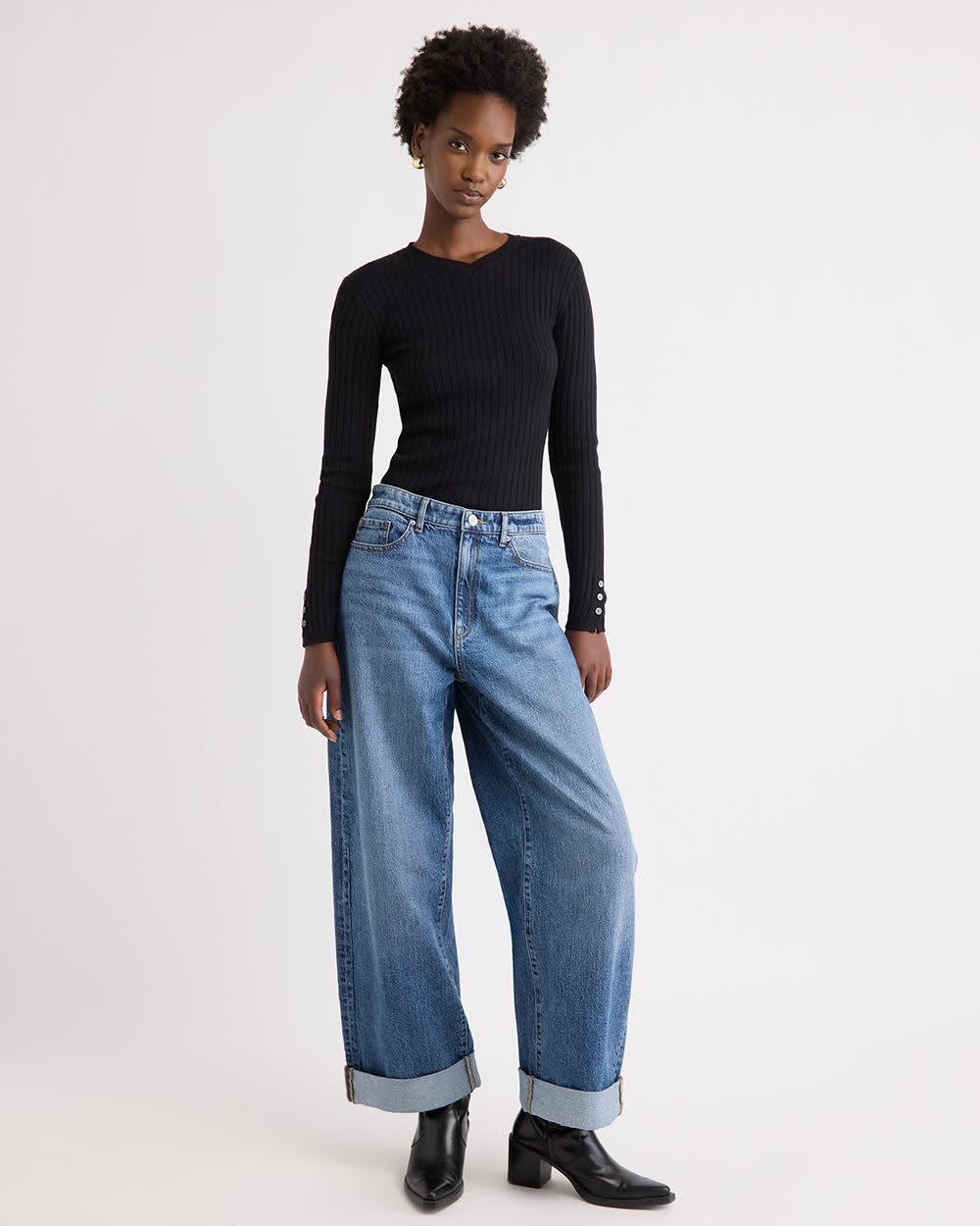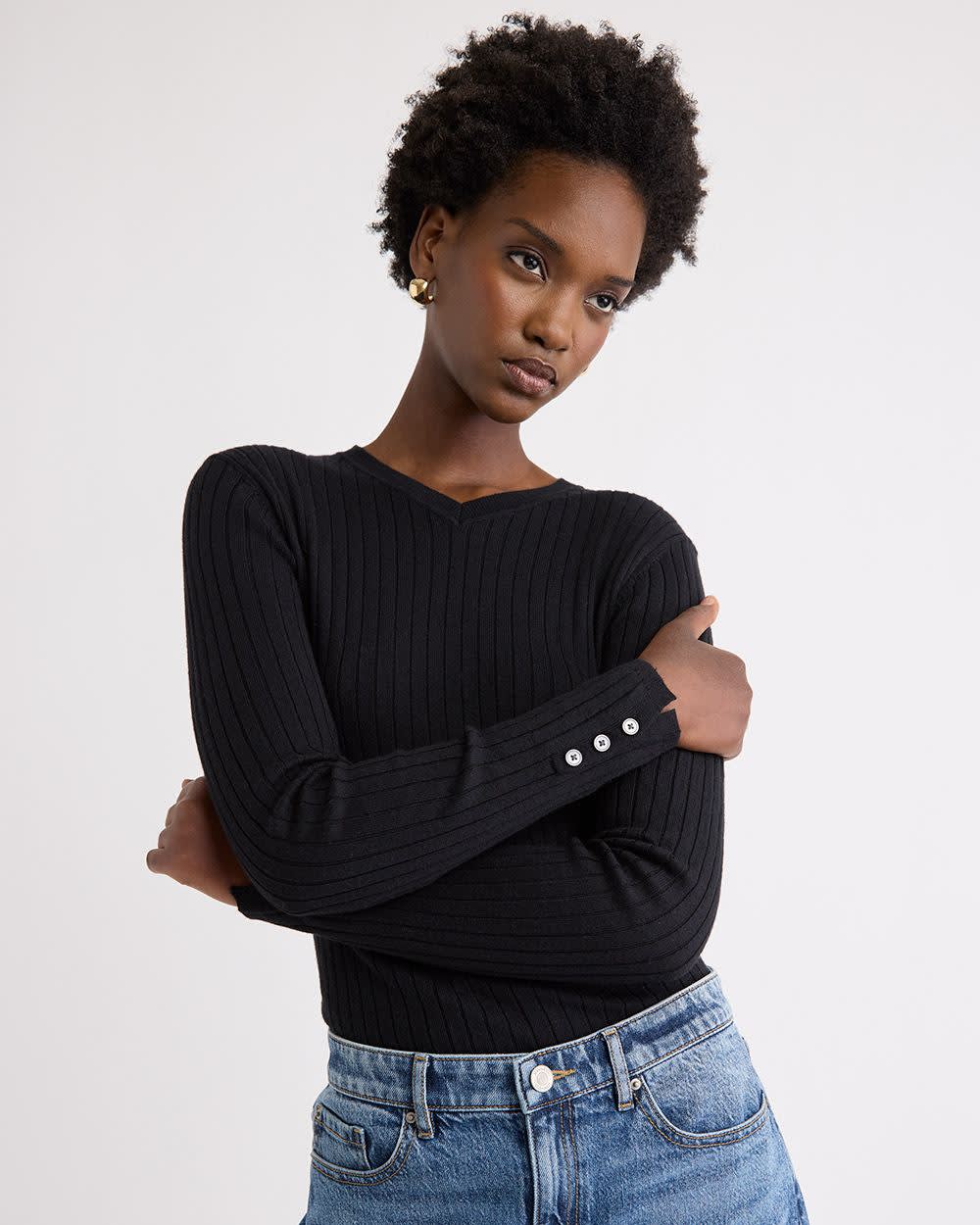 Conçu dans un tricot ultra-doux à motif côtelé, ce pull à col V doté de manches longues décorées de boutons est à la fois sophistiqué et confortable. Portez-le avec une paire de jeans pour un look décontracté ou avec un pantalon habillé pour un style qui saura se démarquer.