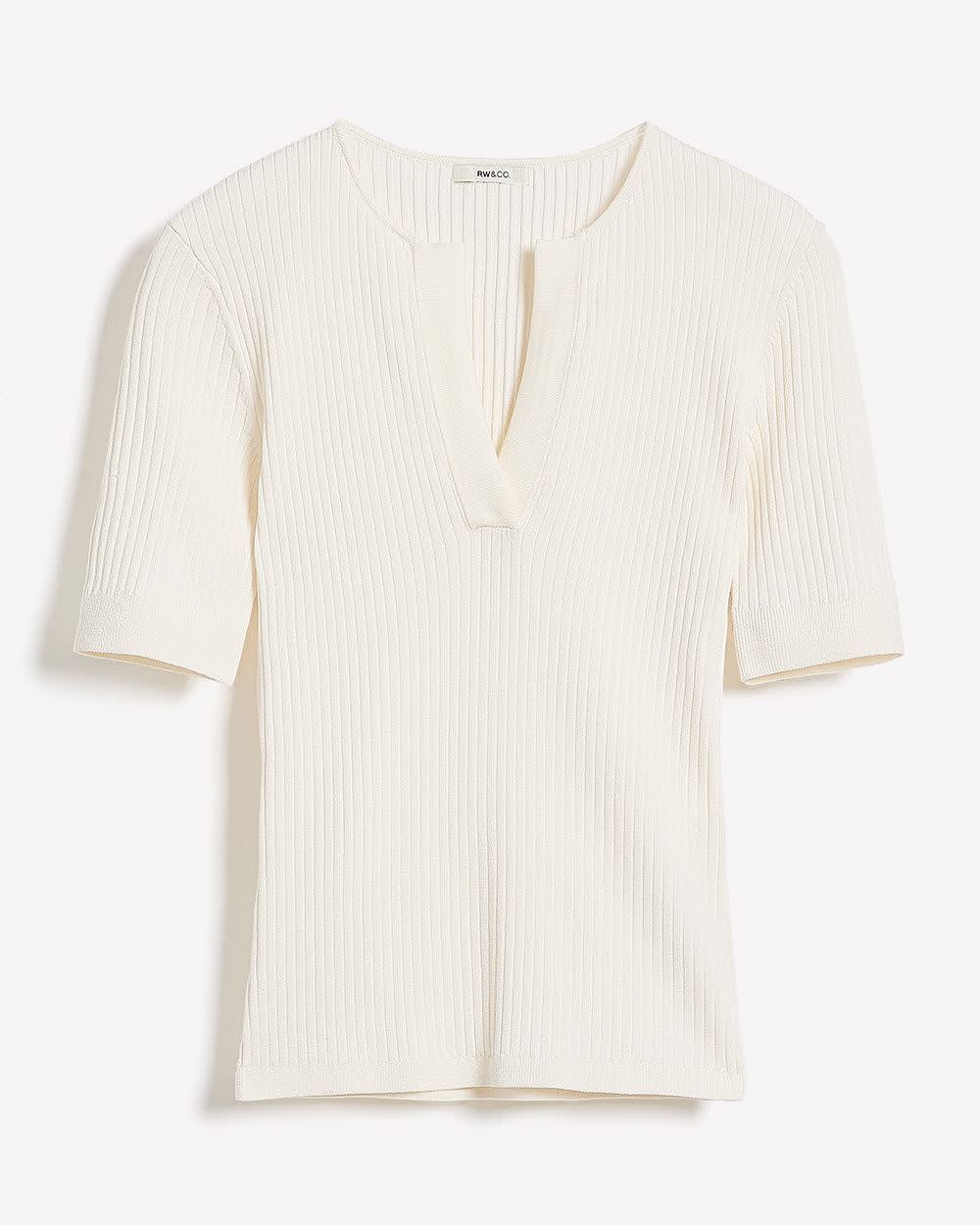 Pull Côtelé à Col Fendu et Manches aux Coudes