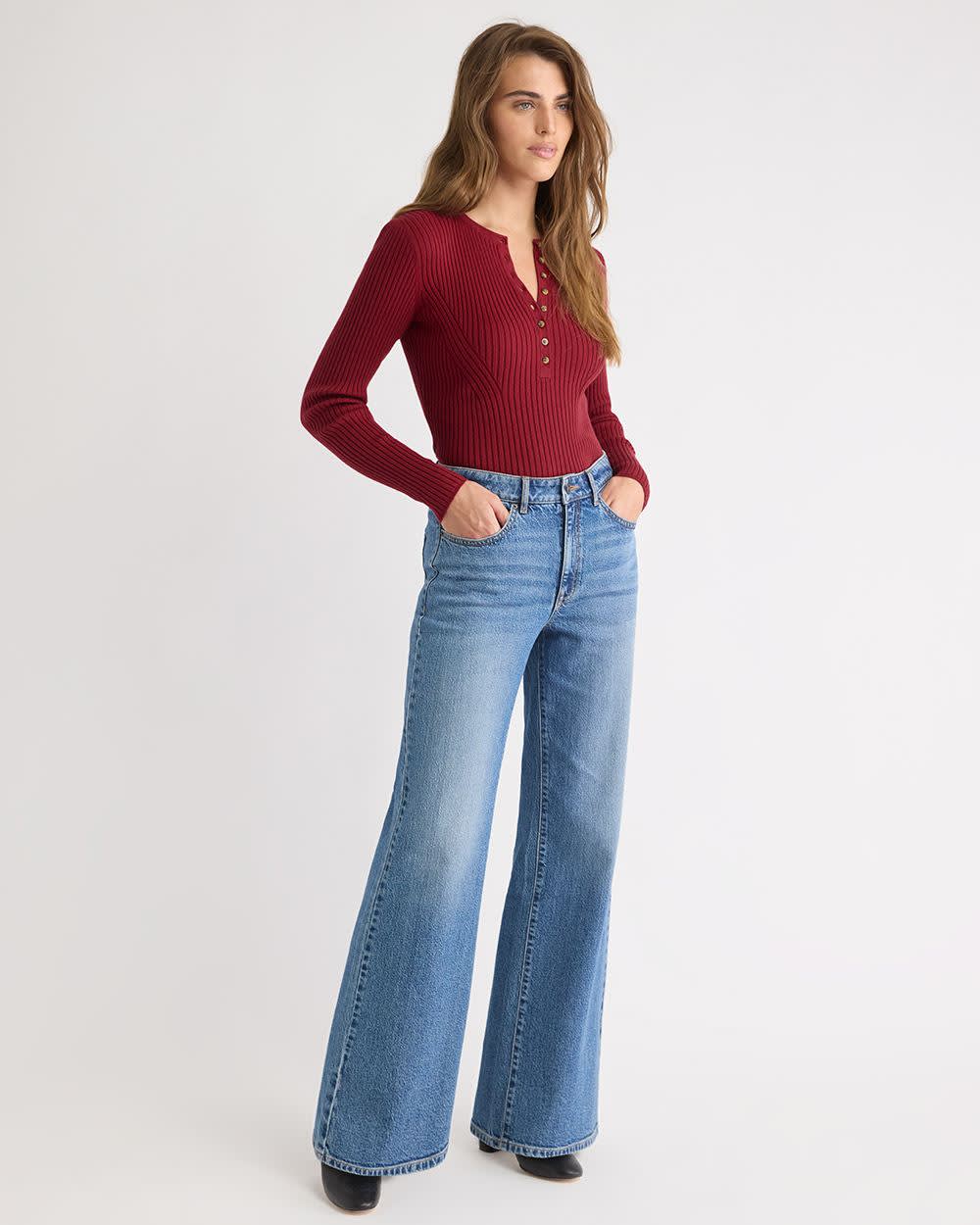Ce pull côtelé doté d'un col rond à patte boutonnée et de mailles de fantaisie est une pièce idéale pour un style polyvalent. Portez-le au bureau avec une paire de pantalons propres, ou avec une paire de jeans le week-end pour un look plus décontracté.