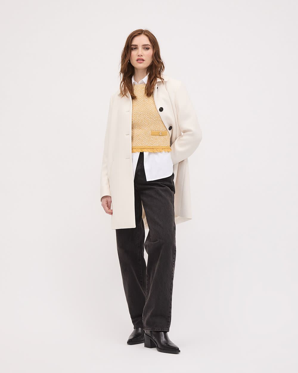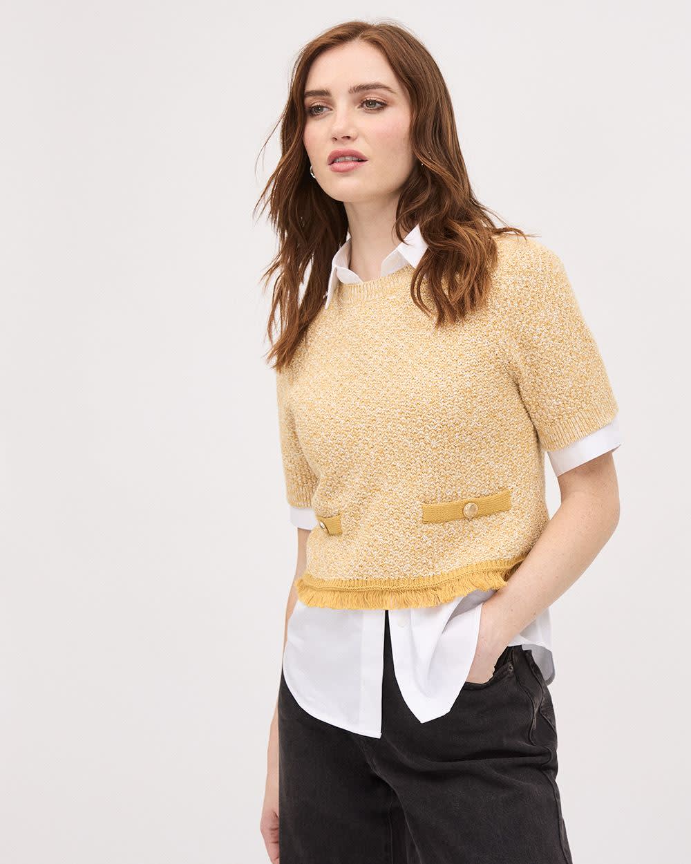 Ce féminin pull à manches courtes conçu en tricot texturé s'agence facilement avec n'importe quel bas, une superbe pièce à ajouter à votre garde-robe