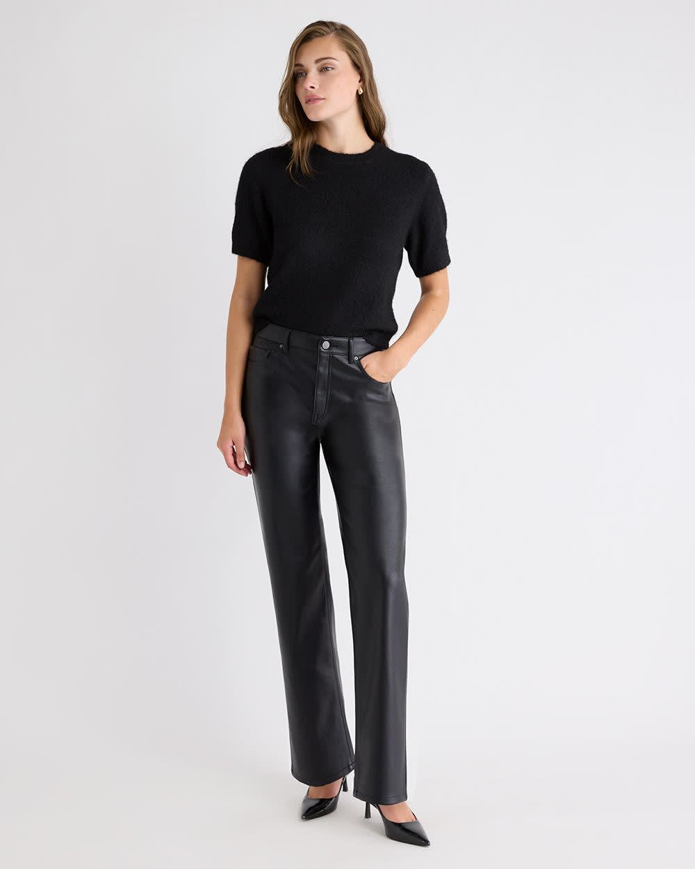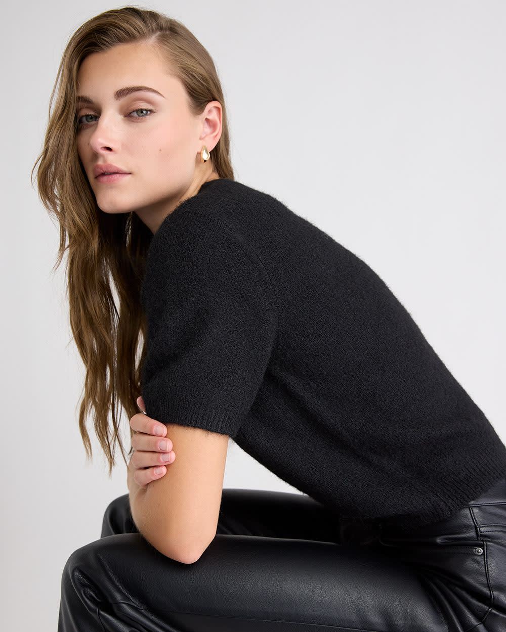 On adore l'unique tricot pelucheux de ce pull à manches courtes. Super mignon et féminin, portez ce haut avec une jupe au bureau ou avec une paire de jeans pour aller jaser au café avec vos amies.