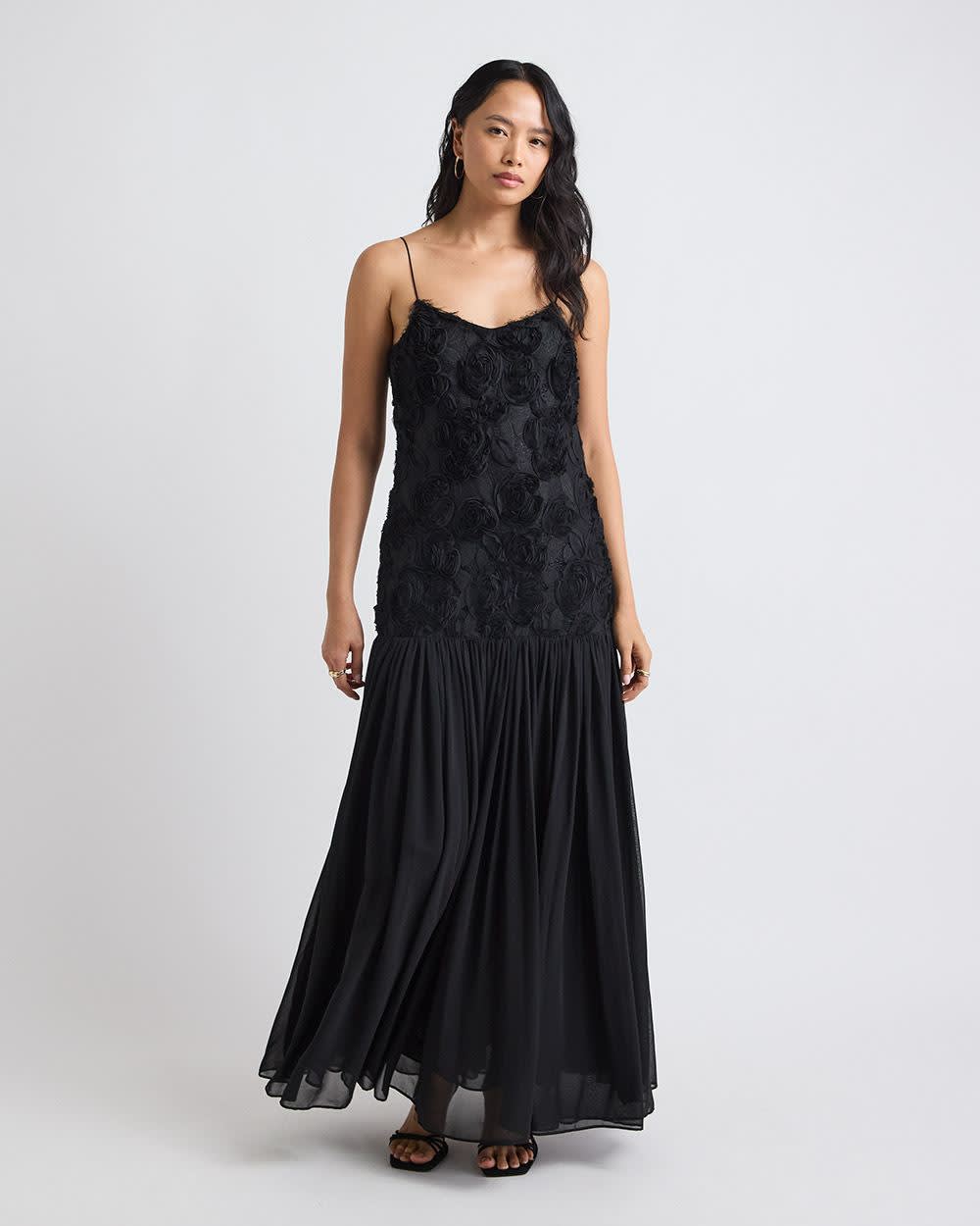 Vous recherchez la robe cocktail parfaite ? La voici. Cette robe maxi cintrée et évasée sans manches dotée d'un haut du corps en maille tissée décoré de fleurs 3D et d'une élégante jupe en mousseline plissée saura assurément se faire remarquer dans une foule.