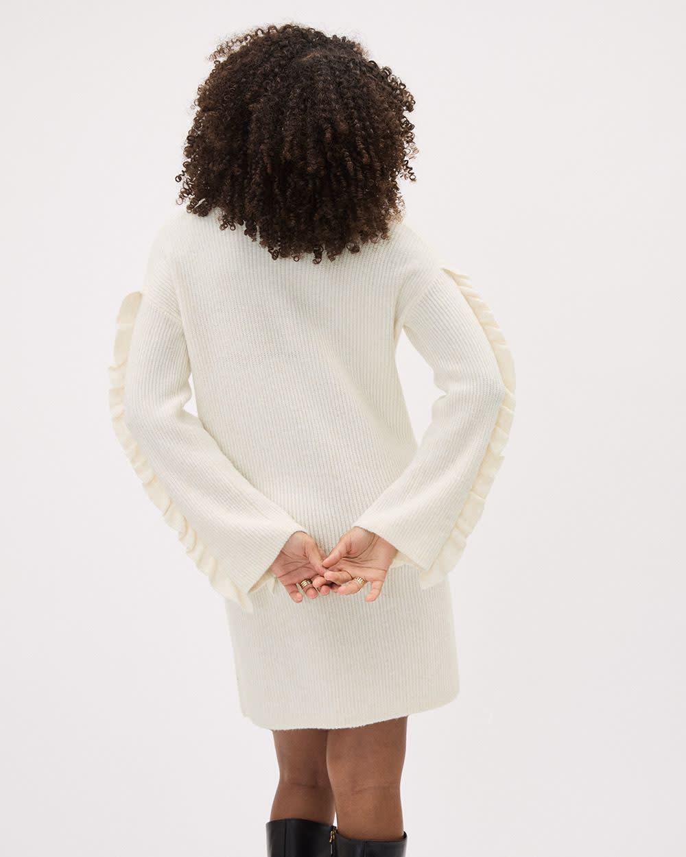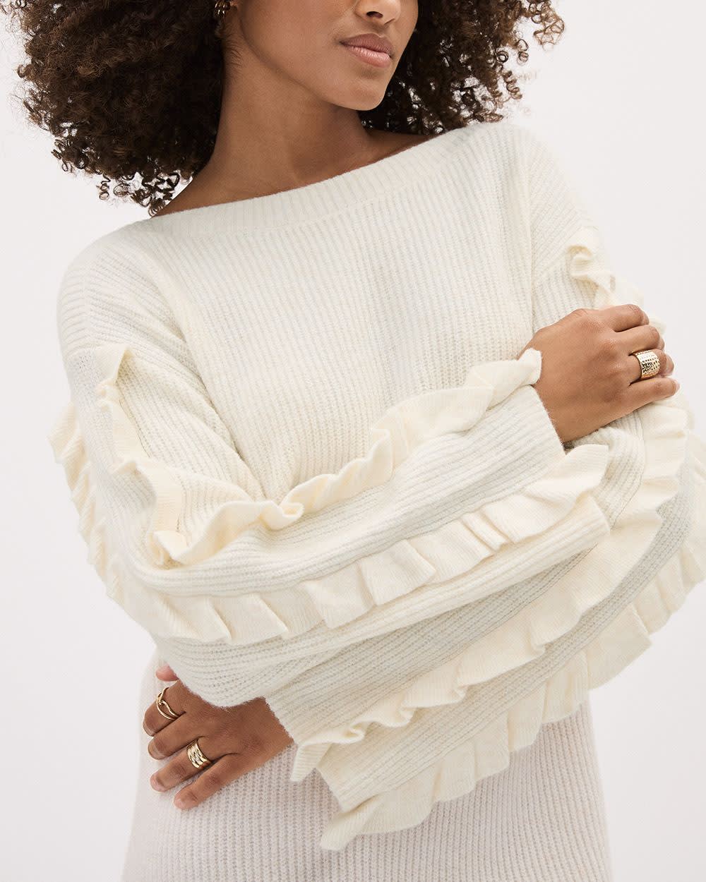 Conçue dans un doux tricot à texture spongieuse, cette robe mini est si confortable que vous ne pourrez plus vous en passer. Dotée de manches longues joliment décorées de volants et d'un col bateau, cette pièce est parfaite pour un style décontracté tendance.