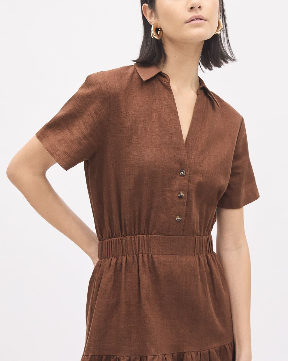 Robe Courte en Lin à Manches Courtes et Col Chemisier