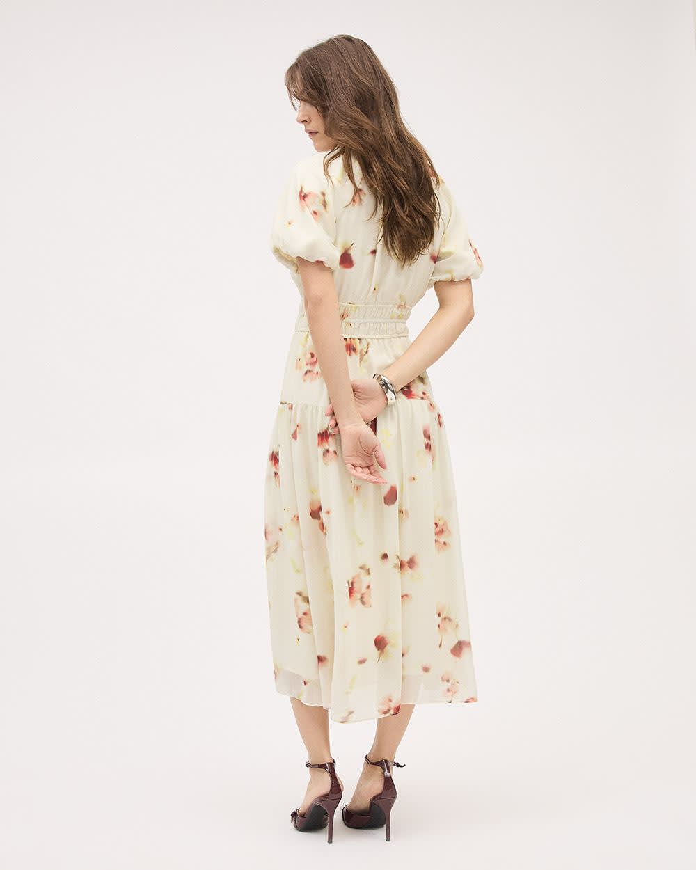 Conçue en mousseline douce et légère, cette magnifique robe midi dotée de superbes manches courtes bouffantes est la pièce dont vous avez besoin pour rehausser votre style lors de toute occasion.