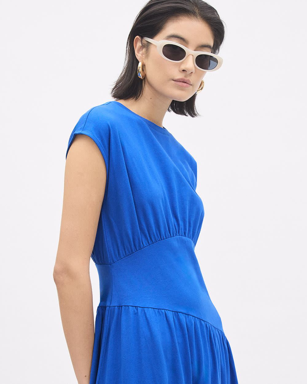 Robe Midi en Jersey à Col Rond et Manches Très Courtes