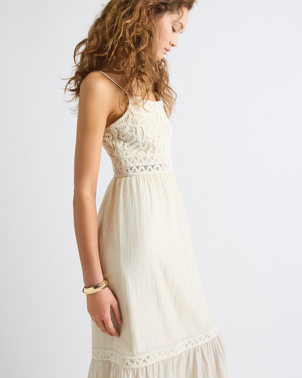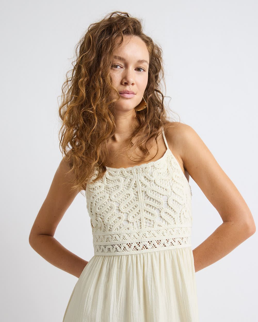 Cette magnifique robe midi sans manches conçue en féminines mailles crochetées au haut du corps est la pièce qu'il vous faut pour vos prochaines vacances au soleil. Portez-la avec une sandale plate pour un style décontracté, ou avec une sandale à talon pour aller souper.