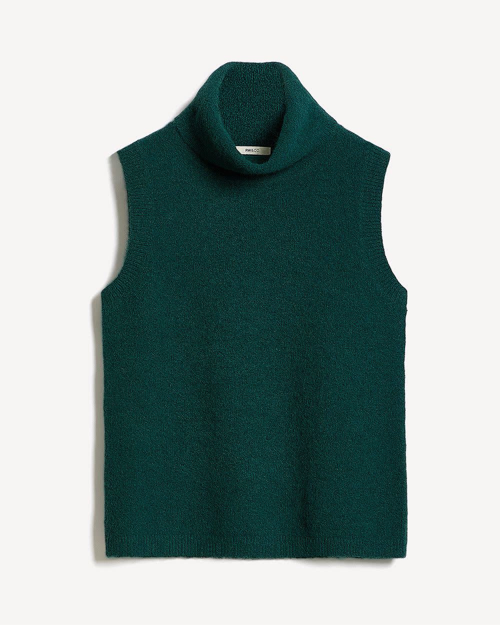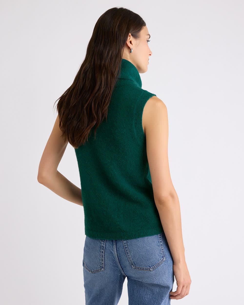 On adore l'unique tricot pelucheux de ce pull sans manches à col roulé. Super mignon et féminin, portez ce haut avec une jupe au bureau ou avec une paire de jeans pour aller jaser au café avec vos amies.