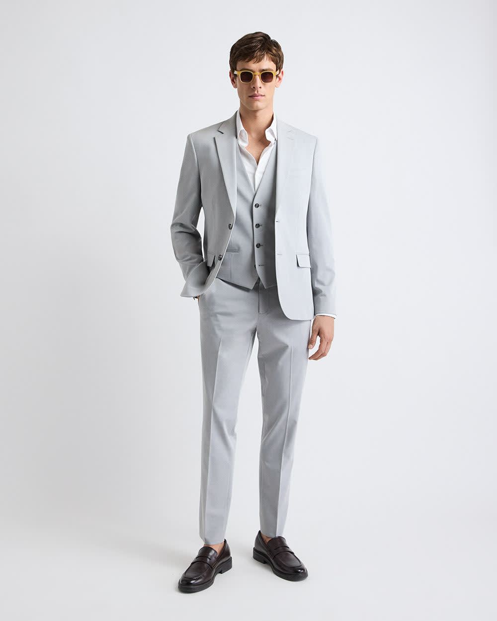 Confort absolu et élégance sophistiquée, c'est ce que vous obtenez avec ce veston à coupe étroite. Conçu dans une superbe teinte gris pâle, ce veston saura assurément rehausser votre style. Pantalon de complet assorti disponible.